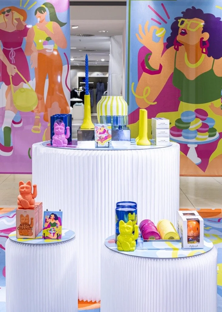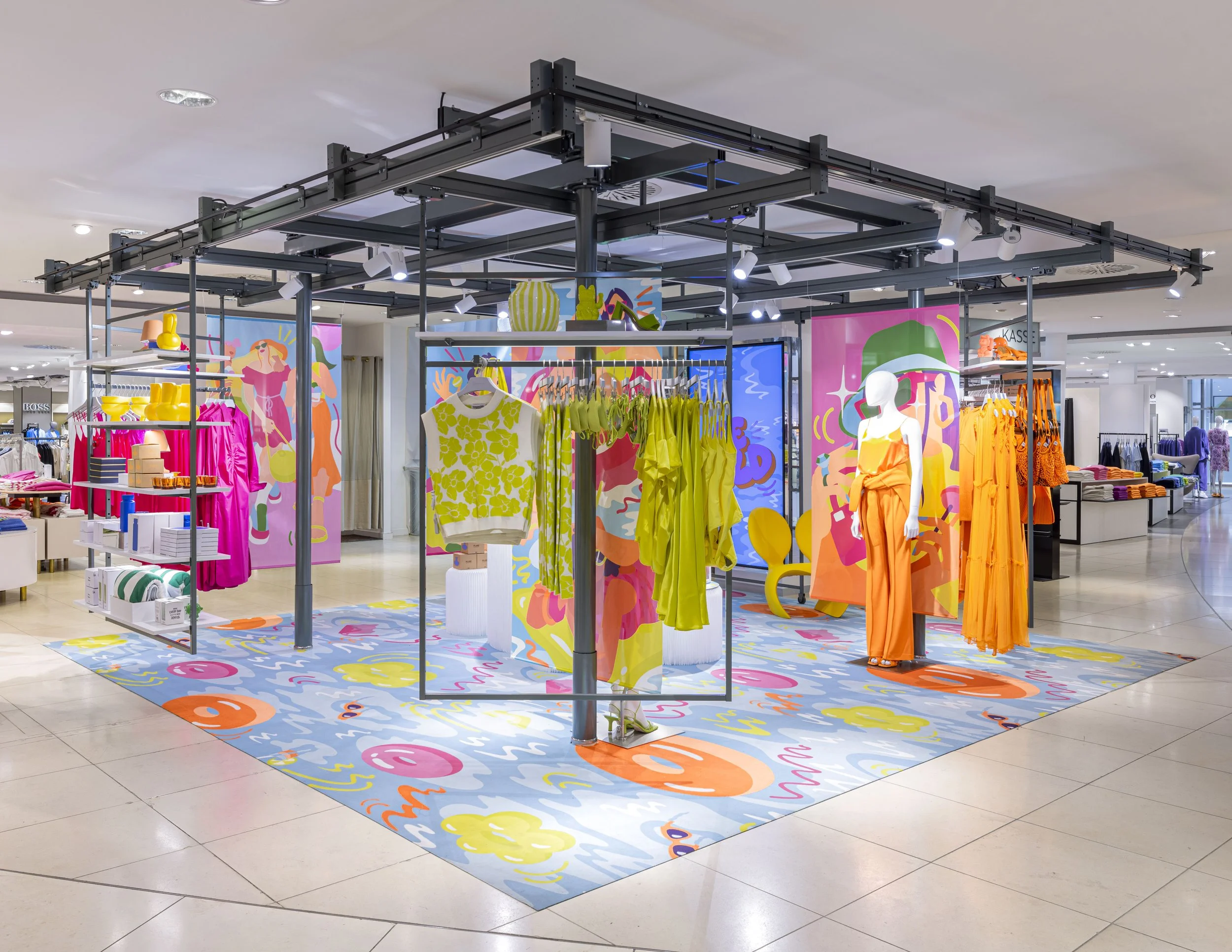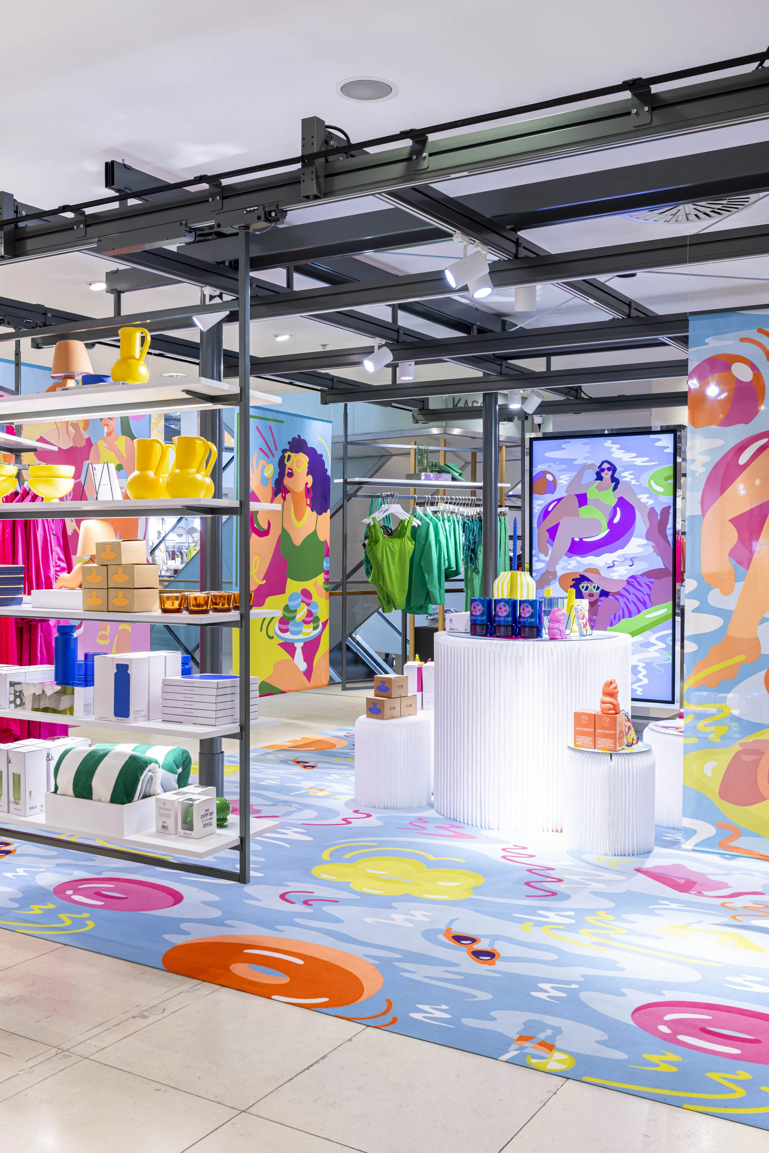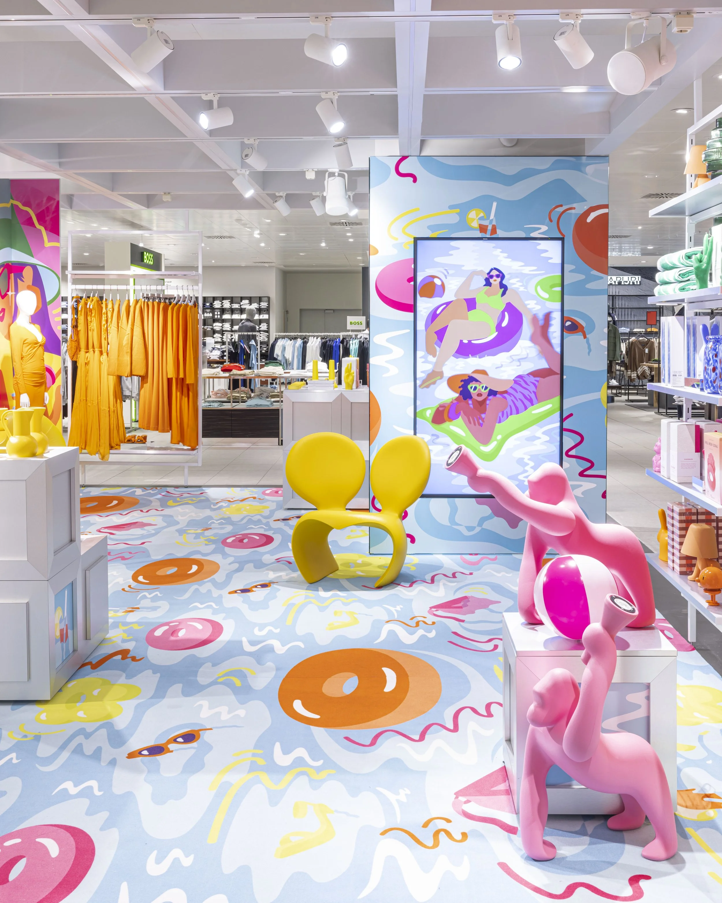 The illustrations were applied across multiple POS elements – from large-scale banners and digital displays to carpet design. Using the Spring/Summer 2023 color palette and strong characters, the visuals were designed to capture visitors’ attention and invite them into a playful world where they could feel empowered and confident.