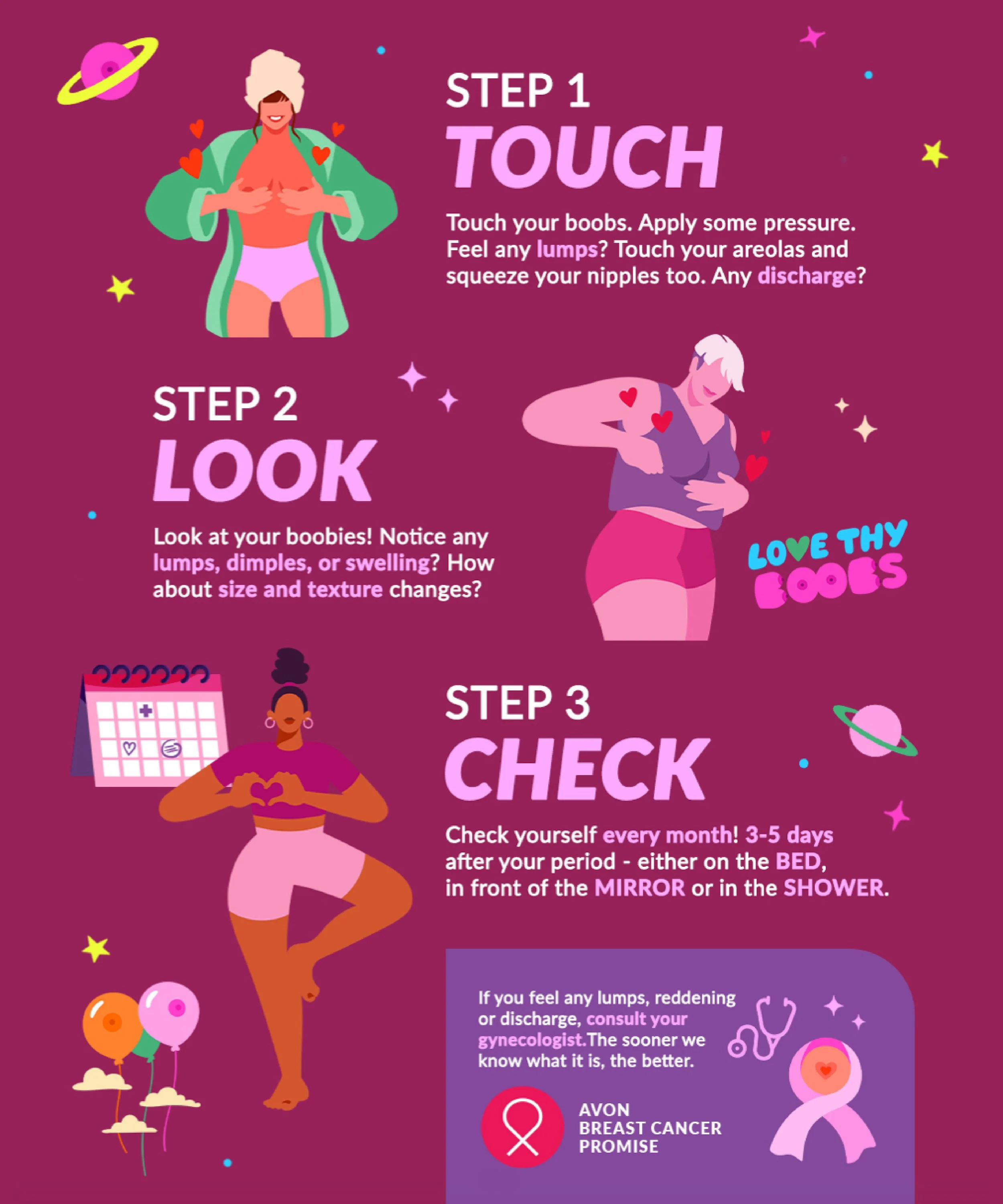 Cheeky illustrations and sticker designs created for Avon’s Boob Love campaign in support of Breast Cancer Awareness Month. The campaign aimed to raise awareness about breast cancer, educate about the signs and symptoms, and encourage self-care, including regular breast self-checks. The illustrations were used across various campaign materials, primarily on social media.