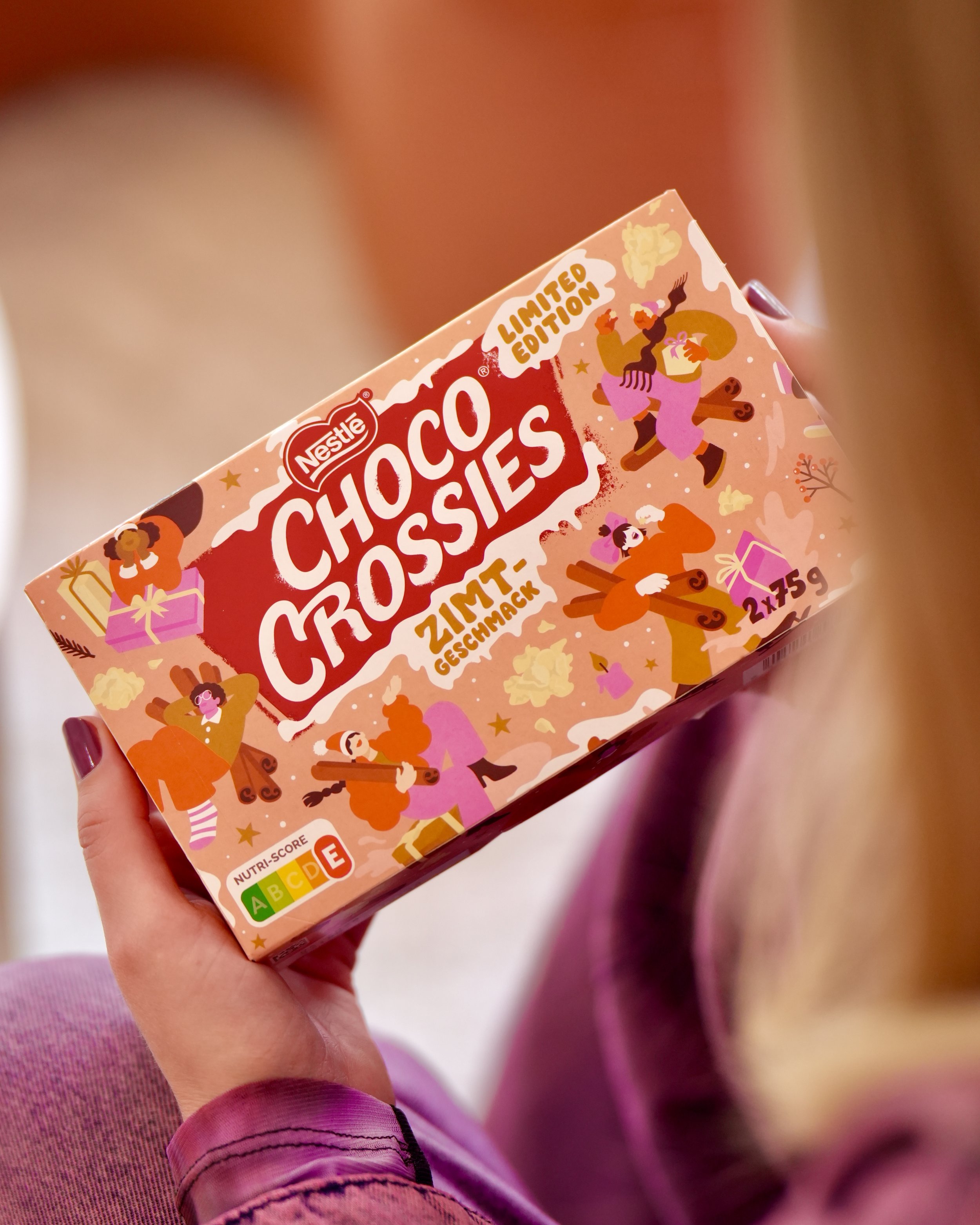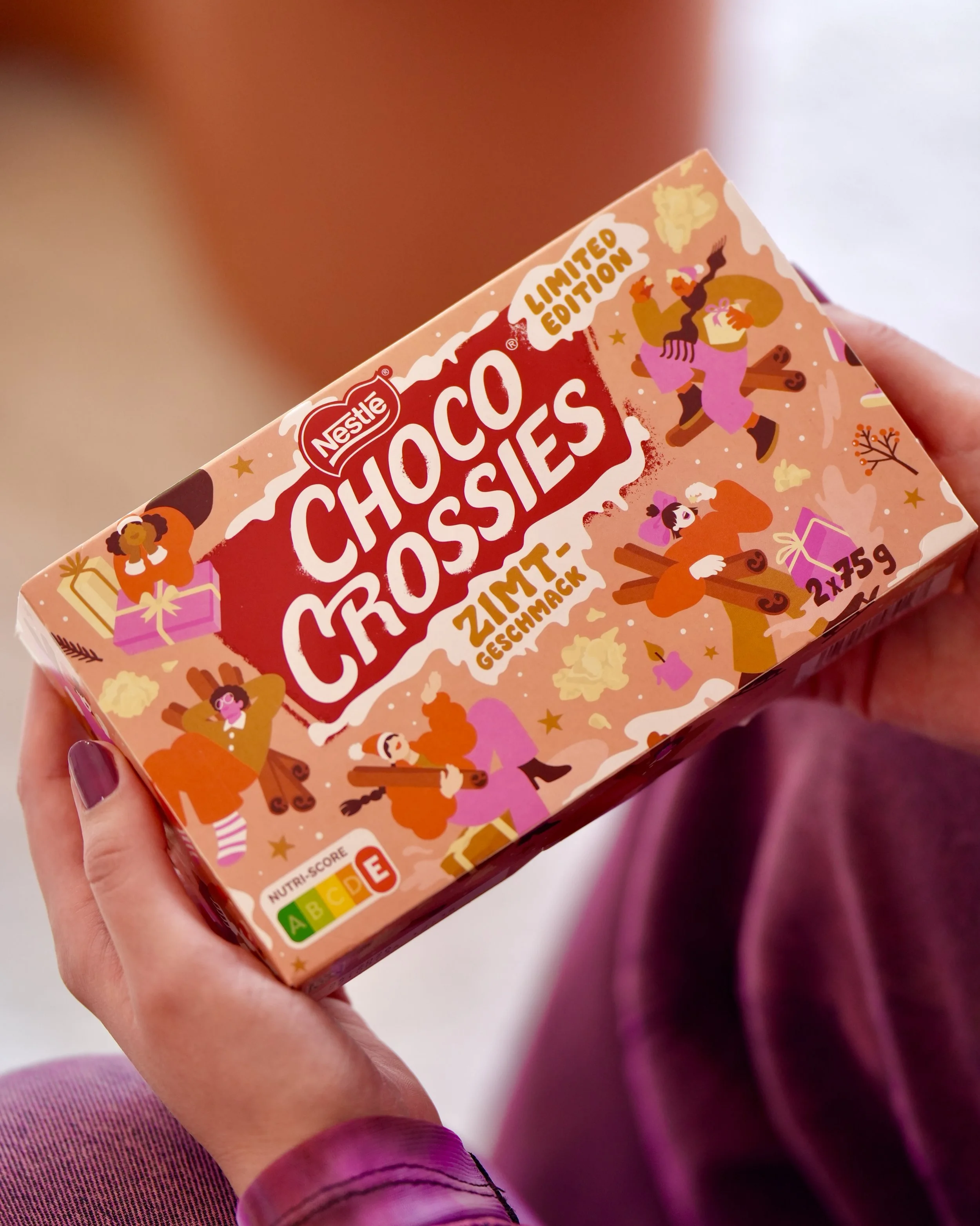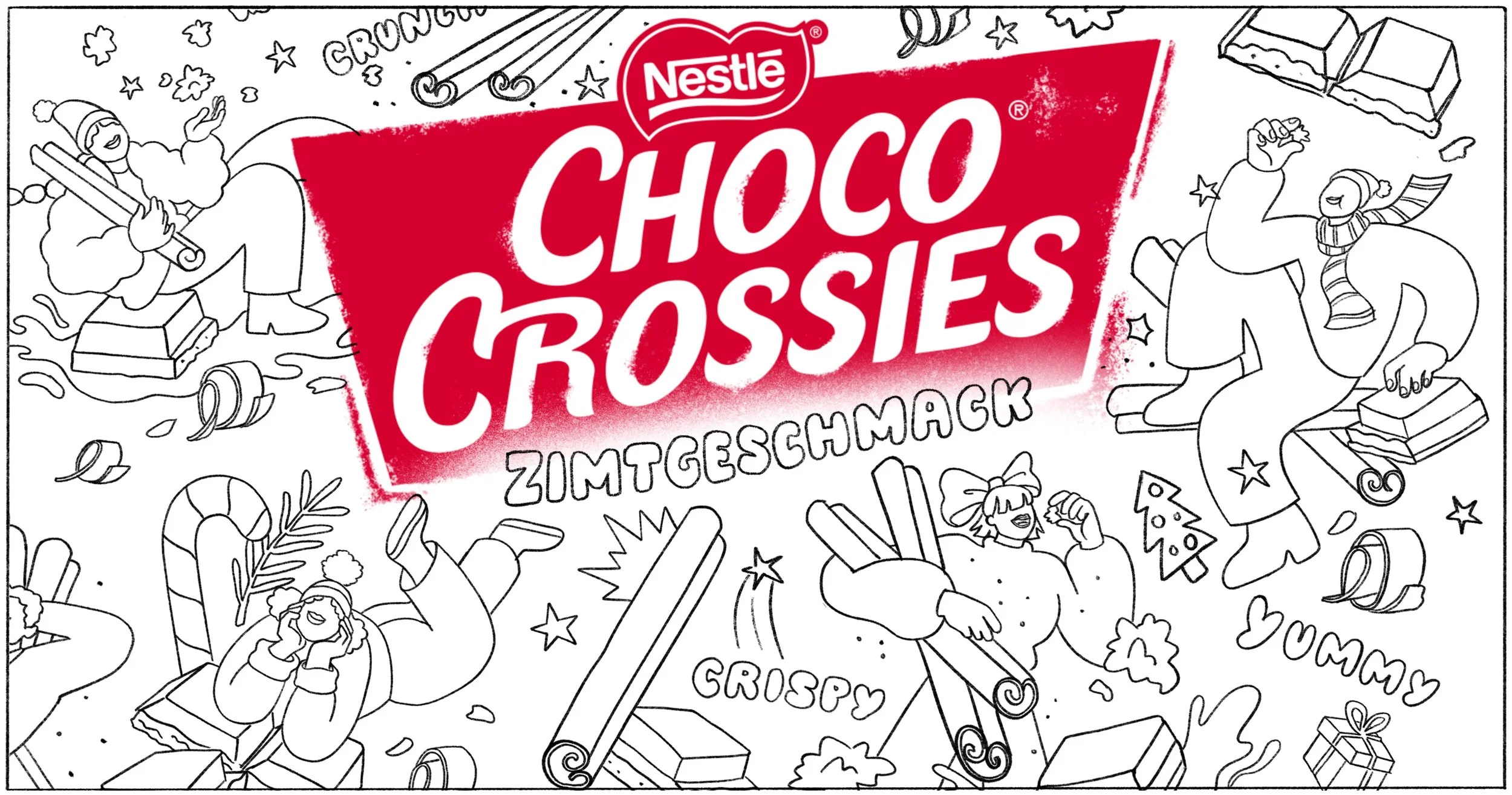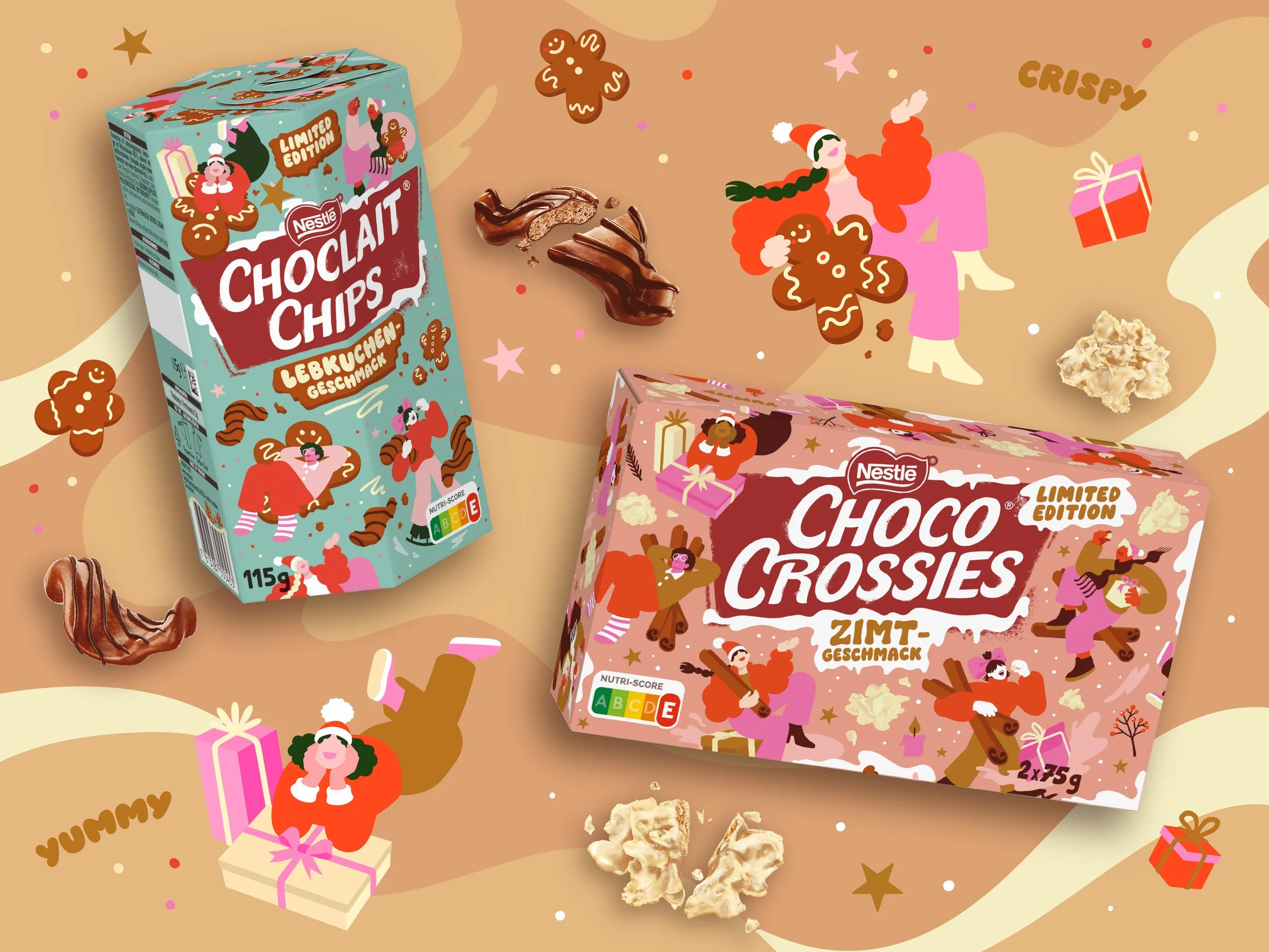 Limited edition holiday packaging design for the German cult sweets Choco Crossies and Choclait Chips. Each variety featured a different seasonal flavor — cinnamon for Choco Crossies and gingerbread for Choclait Chips — which inspired two distinct visual worlds with characters interacting with these flavor-themed environments. The designs were used across packaging, POS materials and advertising in supermarkets across Germany and beyond.