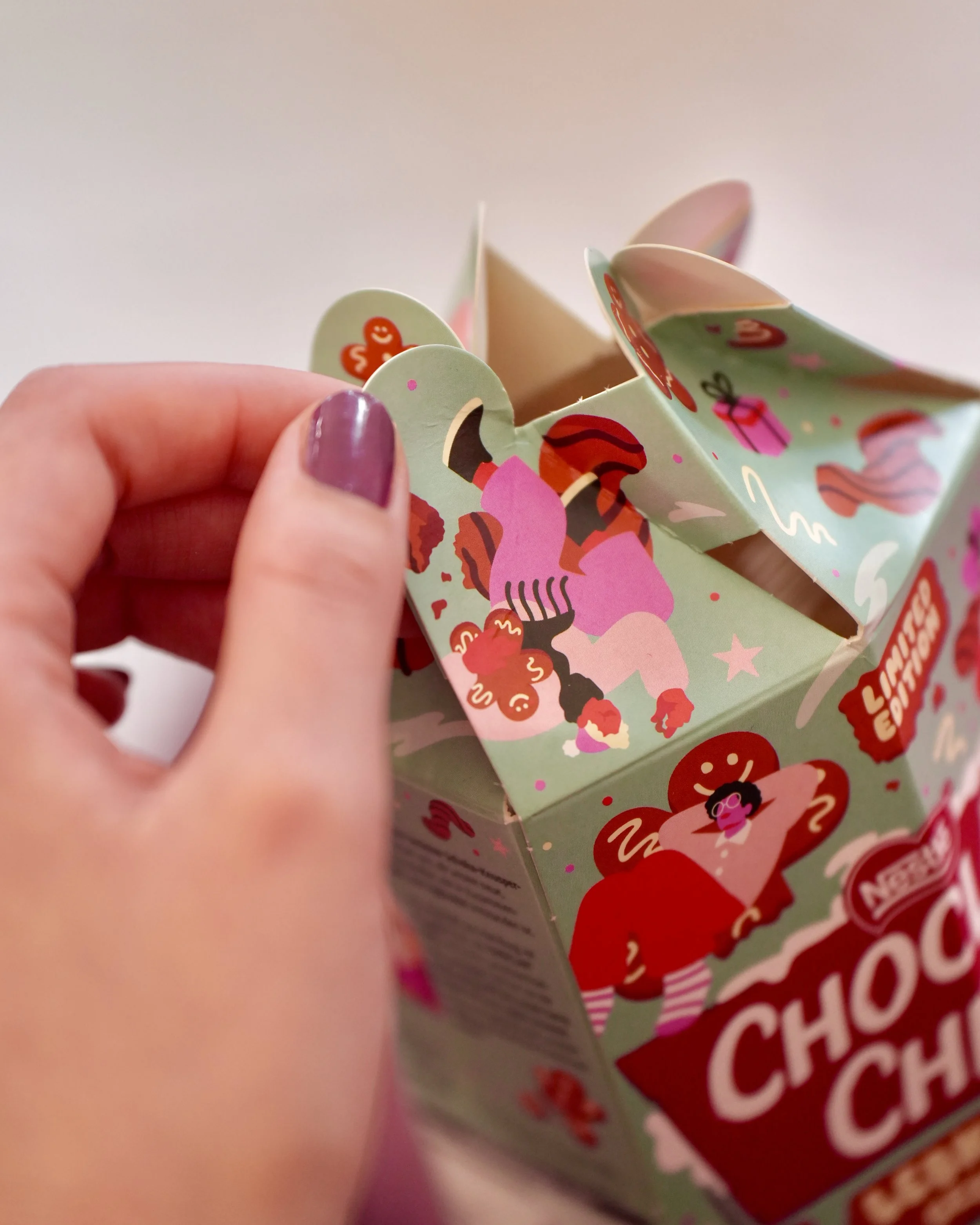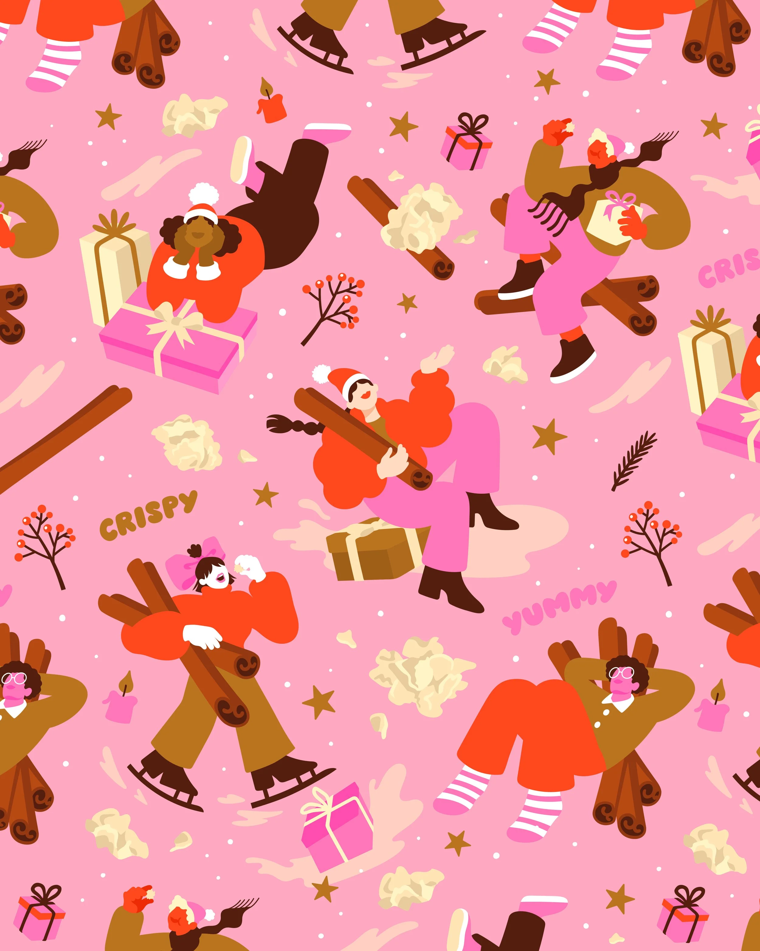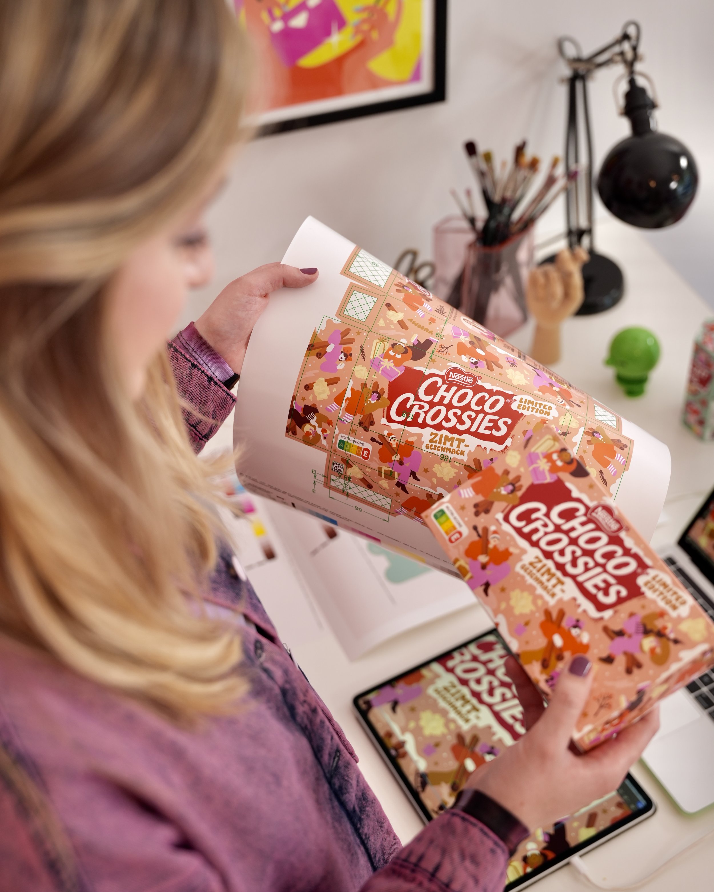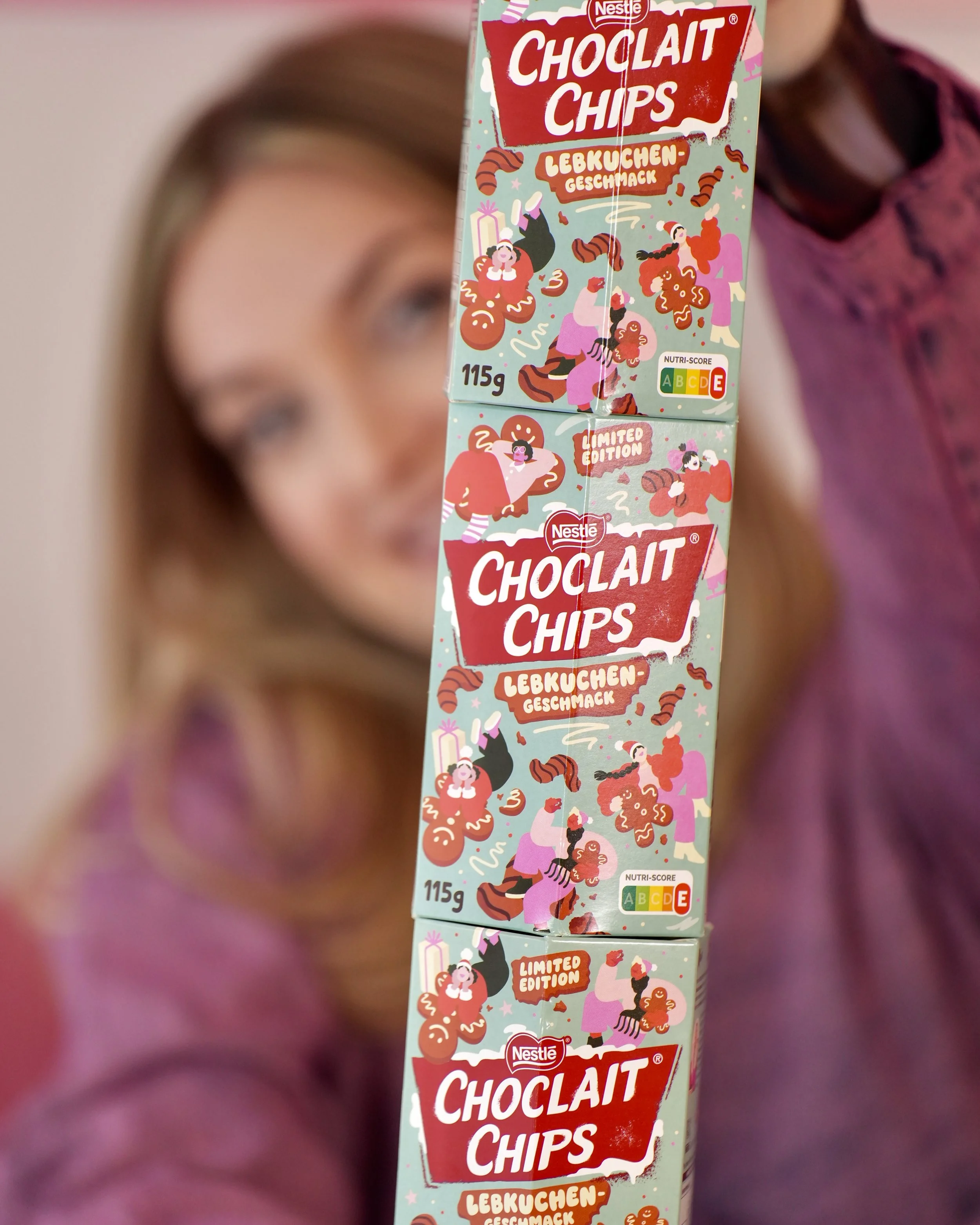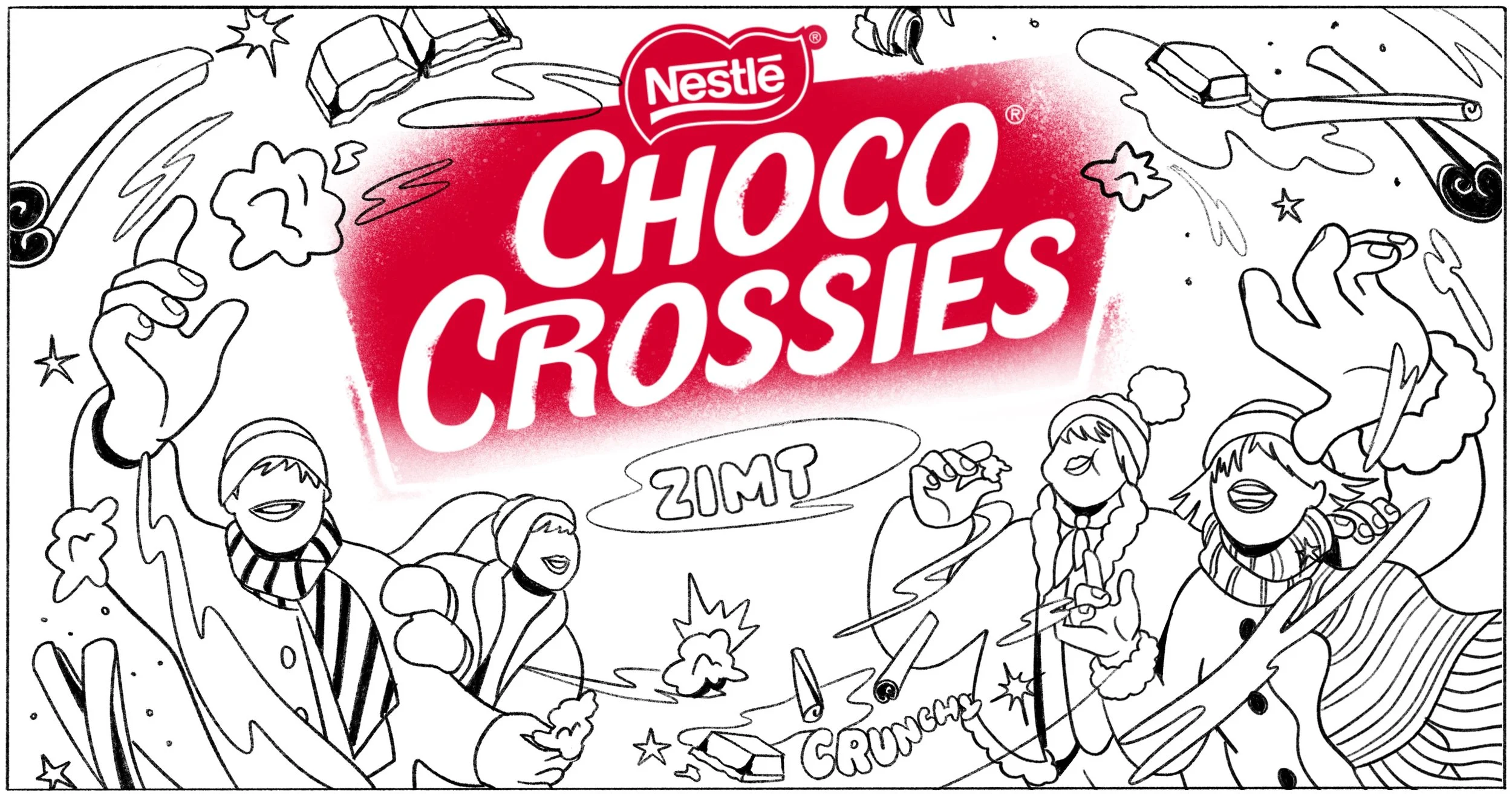 Limited edition holiday packaging design for the German cult sweets Choco Crossies and Choclait Chips. Each variety featured a different seasonal flavor — cinnamon for Choco Crossies and gingerbread for Choclait Chips — which inspired two distinct visual worlds with characters interacting with these flavor-themed environments. The designs were used across packaging, POS materials and advertising in supermarkets across Germany and beyond.