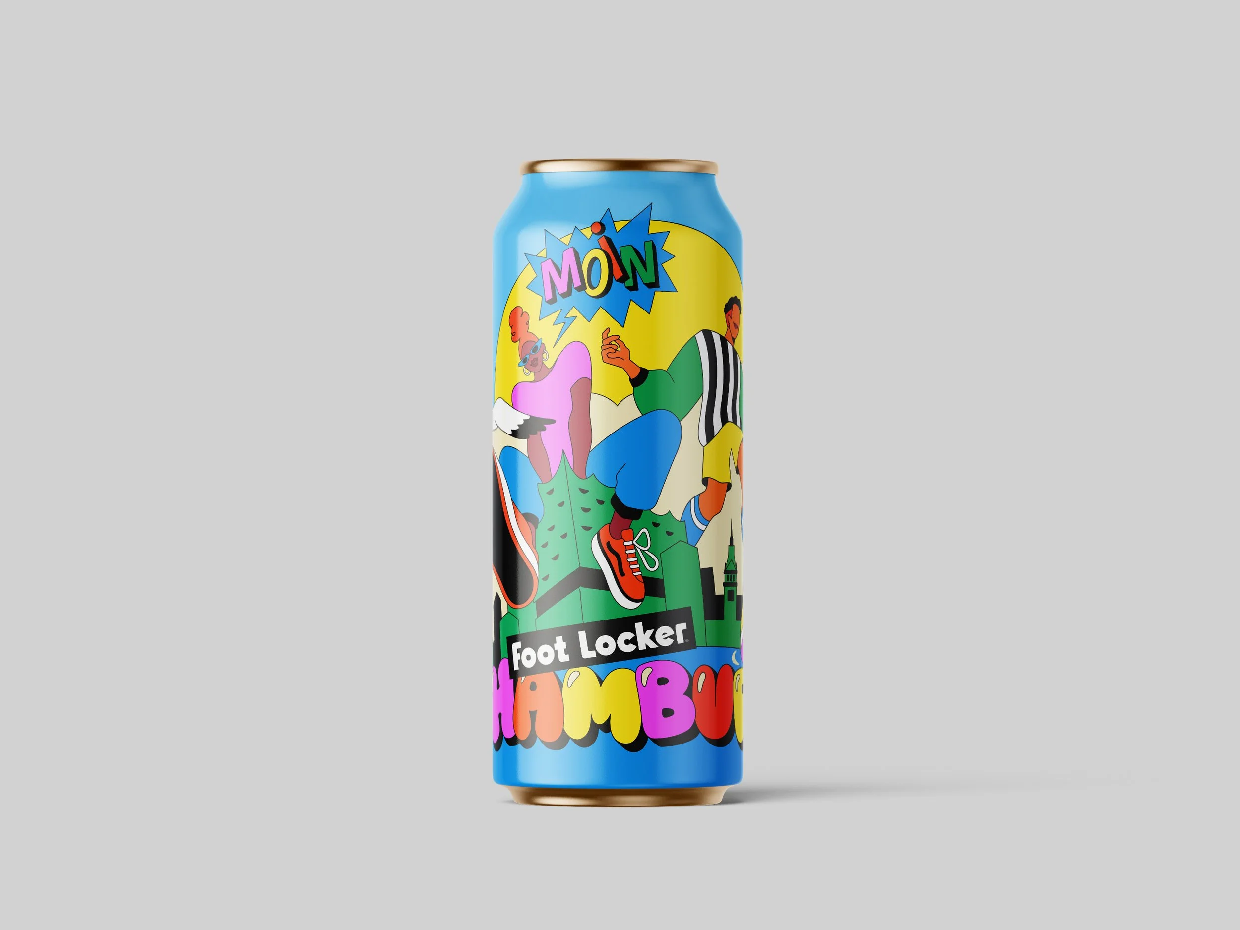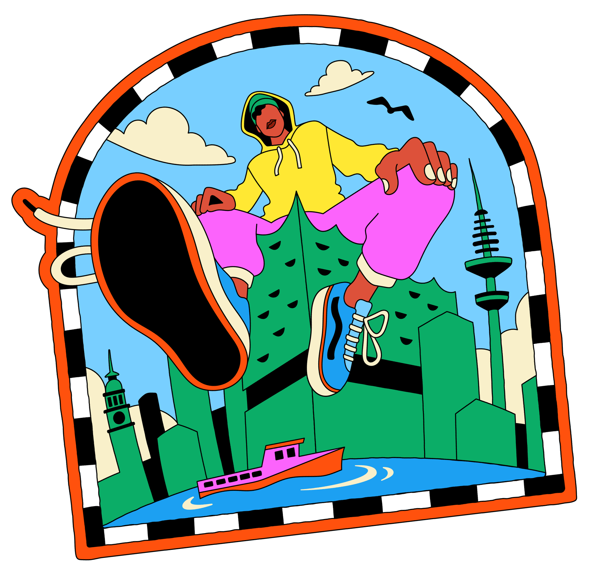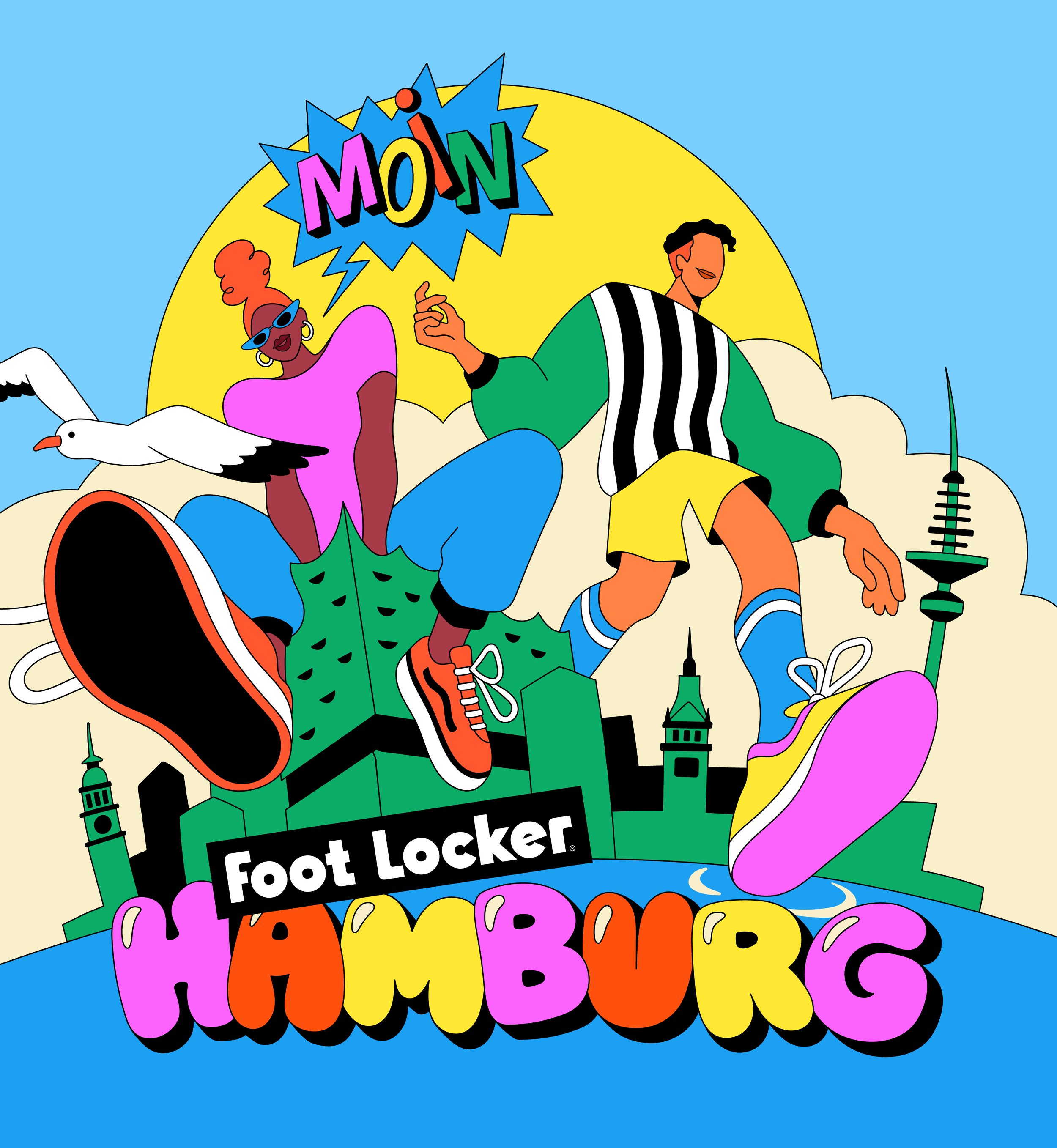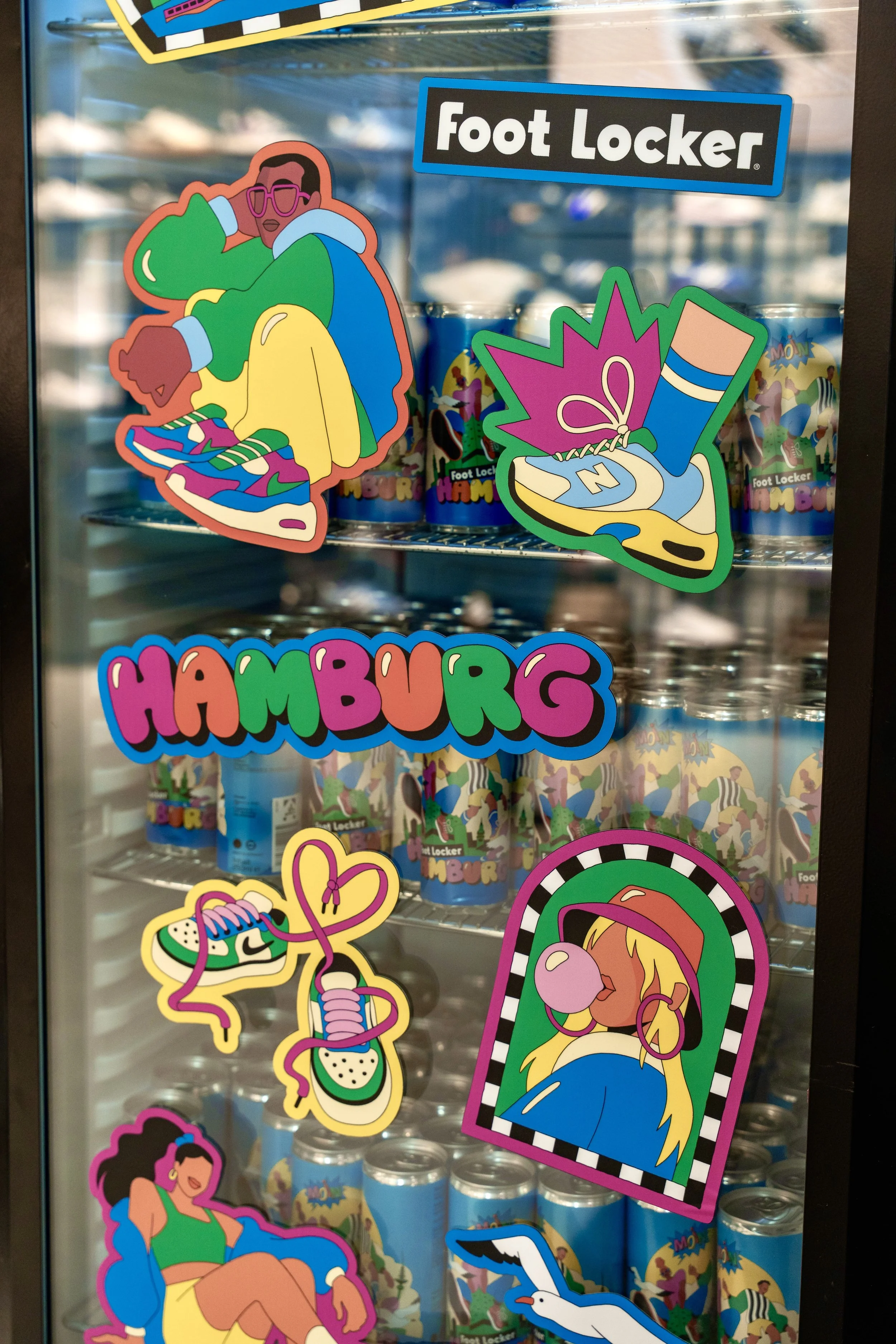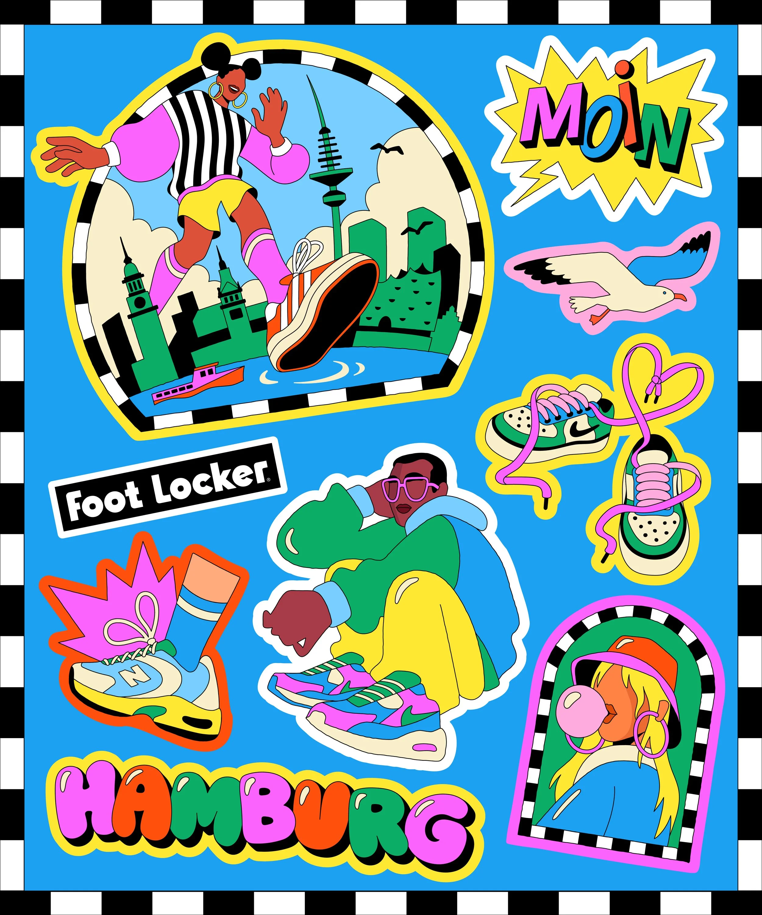 Sticker illustrations for promotional merchandise for the opening of a new Foot Locker store in Hamburg. The designs combined street style and sneaker culture with iconic Hamburg elements. During the opening event, the graphics were applied via heat press onto giveaway T-shirts, and were also produced as sticker sheets and printed on soda cans.