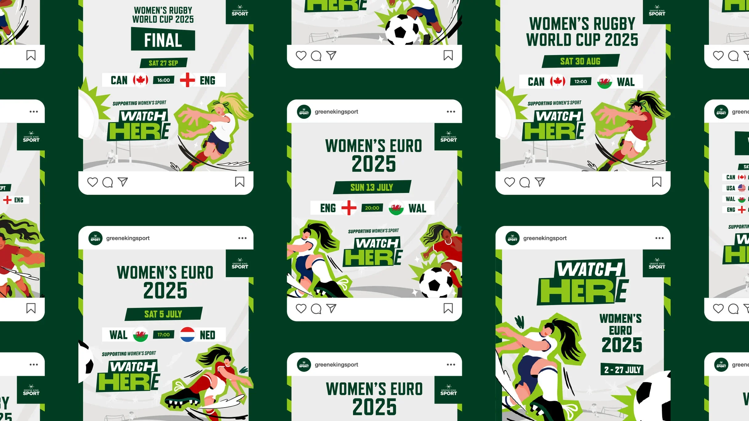 An empowering character set developed for the campaign to celebrate and promote women’s sport during the Women’s Euros 2025 and the Women’s Rugby World Cup 2025. The illustrations were brought to life across promotional assets, in-pub digital POS and energetic animations, creating a vibrant and engaging campaign world.
